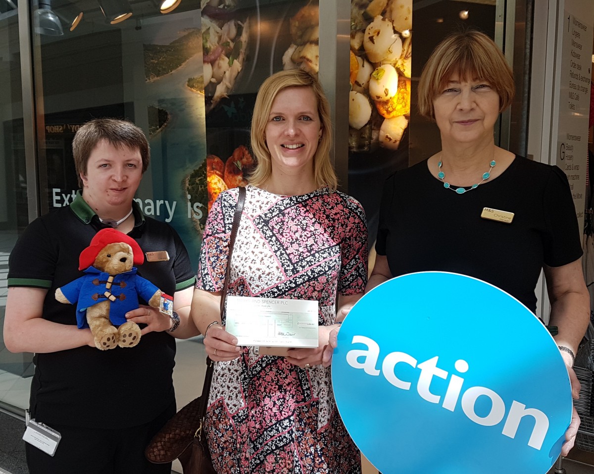 On Wednesday 17 May, Action’s Community Fundraiser Katia King was presented with a cheque for £2,959 by Hospitality Manager at M&S Horsham, Christine Beet. Katia says the store’s support has been incredible: “We honestly cannot thank all the staff and customers at Marks and Spencer in Horsham enough.